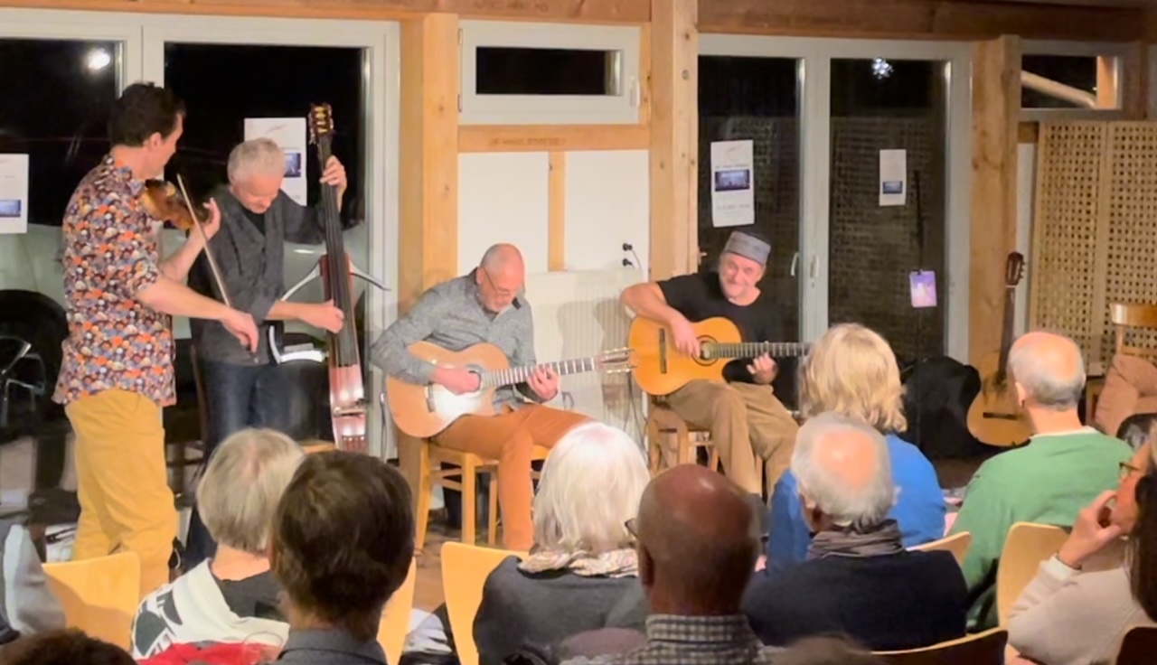 Am Samstag, den 25. November um 18:00 Uhr war es endlich wieder soweit. Im Rahmen der Eventreihe „Kultur in der Scheune“ trat das Jan-Vanek-Ensemble im Heimathaus auf. Knapp 100 Zuschauer konnten erleben, was man mit einer Gitarre anstellen kann. Der Namensgeber des Ensembles trommelte, zupfte und zog die Seiten derart, dass man schon Angst um den Erhaltungszustand seines Instruments haben musste. Aber der Funke sprang auf das Publikum über. Selten hat der Autor dieser Zeilen eine derartige Virtuosität auf einer Gitarre erlebt. Versunken in die Welt seiner Eigenkompositionen ließ Jan Vanek das Publikum an seinen Reisen in die entlegensten Orte teilhaben. Ermöglicht hat dies mit seinen Erläuterung der exzellent aufspielende Geiger. Ein elektrischer Kontrabass und eine zusätzlich begleitende Gitarre vervollständigen das Bild eines abgestimmt aufspielenden Quartetts. Service und Verköstigung waren wie immer top. Unser Dorf lebt und freut sich auf weitere Veranstaltungen.